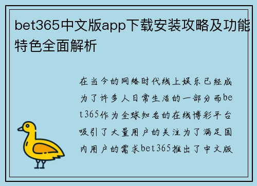 在当今的网络时代,线上娱乐已经成为了许多人日常生活的一部分,而bet365作为全球知名的在线博彩平台,吸引了大量用户的关注。为了满足国内用户的需求,bet365推出了中文版APP,使得玩家能够更加便捷地体验到各种体育赛事、棋牌、老虎机等娱乐项目。本文将从四个方面全面解析bet365中文版APP的下载安装攻略及功能特色,帮助大家更好地了解该平台的使用方法和优势。